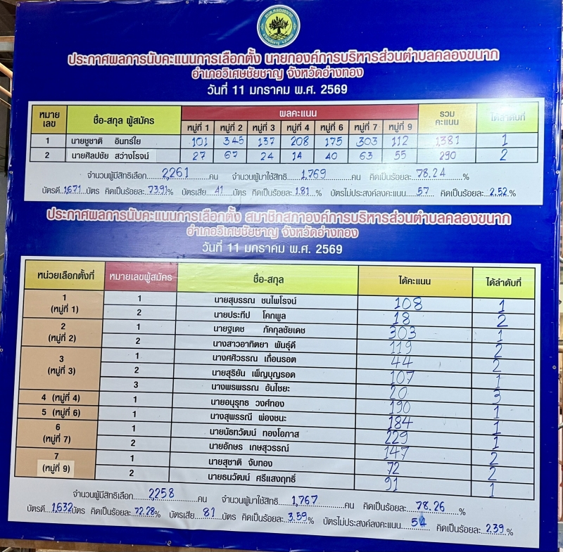 องค์การบริหารส่วนตำบลคลองขนาก จัดการเลือกตั้ง สมาชิกสภา และนายก อบต. ในวันที่ 11 มกราคม 2569 และประกาศผลการนับคะแนนการเลือกตั้ง เสร็จเรียบร้อย