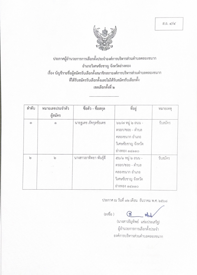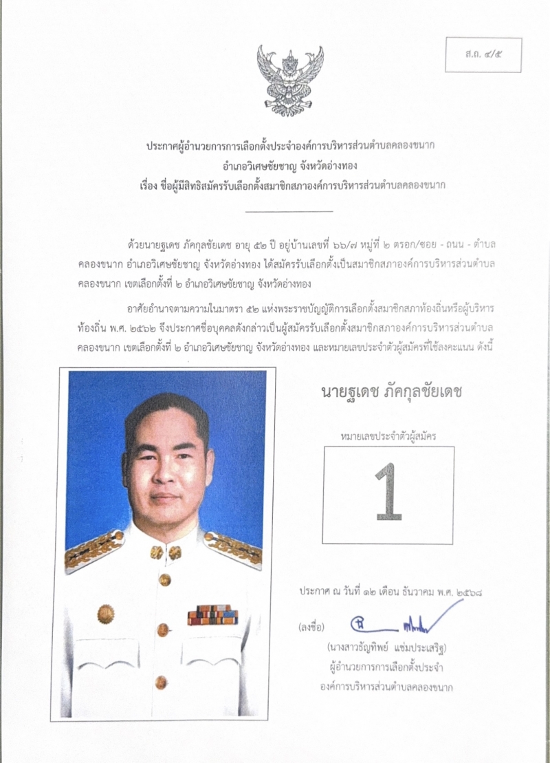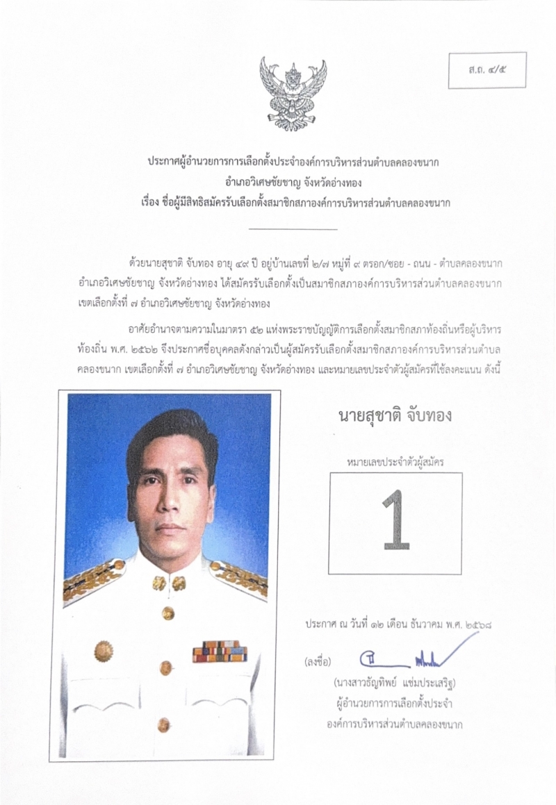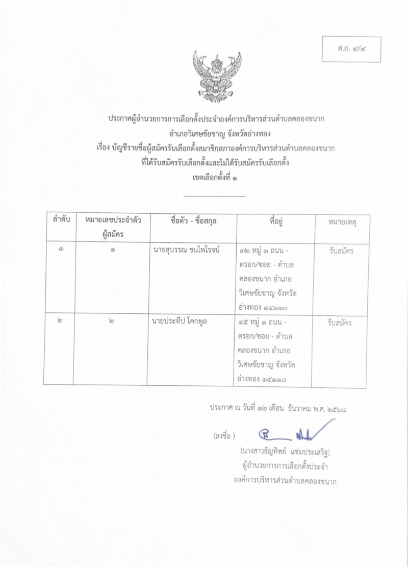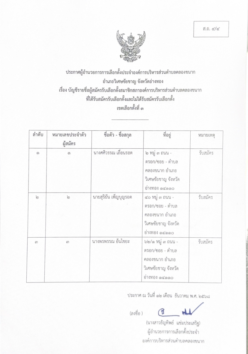 องค์การบริหารส่วนตำบลคลองขนาก ประกาศรายชื่อผู้มีสิทธิรับเลือกตั้ง สมาชิกสภา อบต. และ ผู้บริหารท้องถิ่น (ส.ถ. ผ.ถ. 4/4 และ 4/5 )