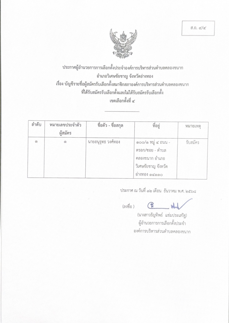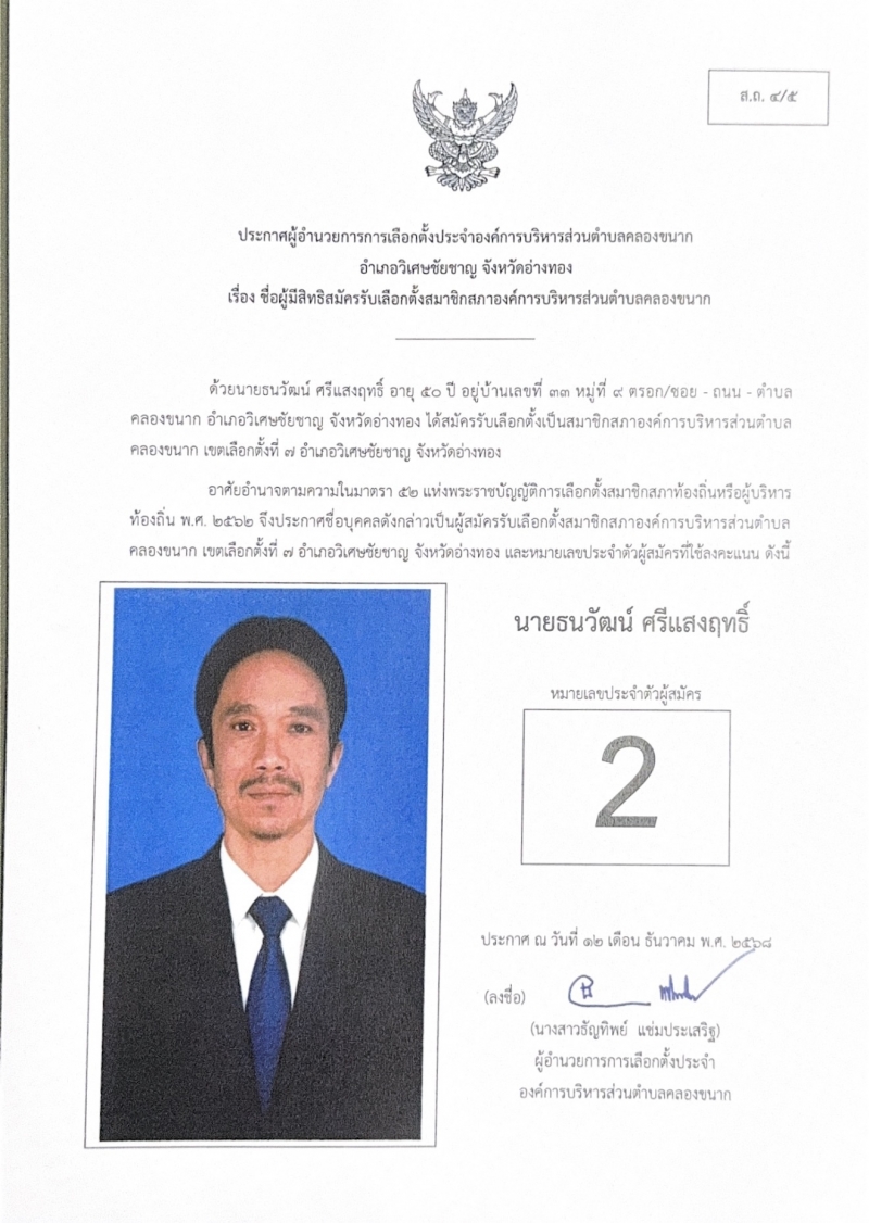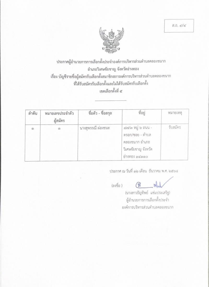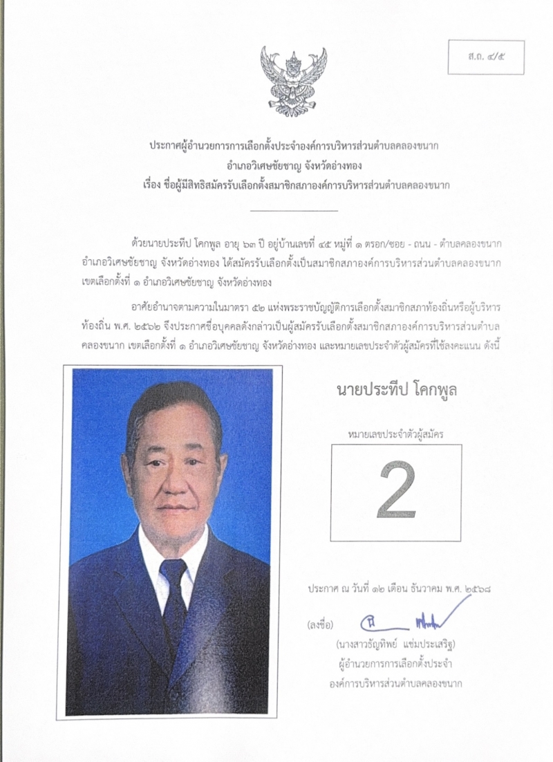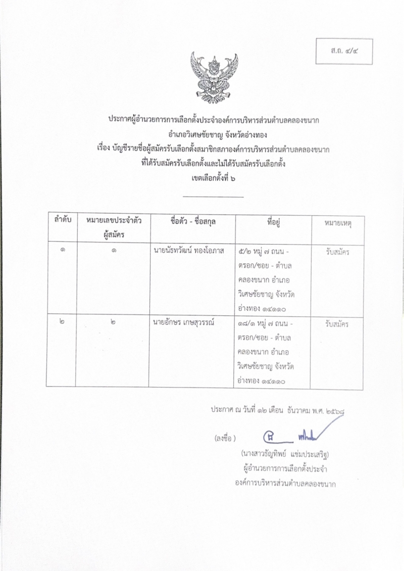 องค์การบริหารส่วนตำบลคลองขนาก ประกาศรายชื่อผู้มีสิทธิรับเลือกตั้ง สมาชิกสภา อบต. และ ผู้บริหารท้องถิ่น (ส.ถ. ผ.ถ. 4/4 และ 4/5 )
