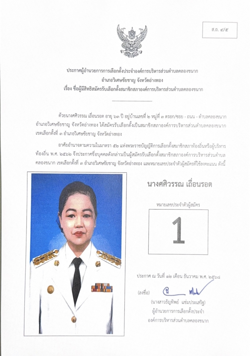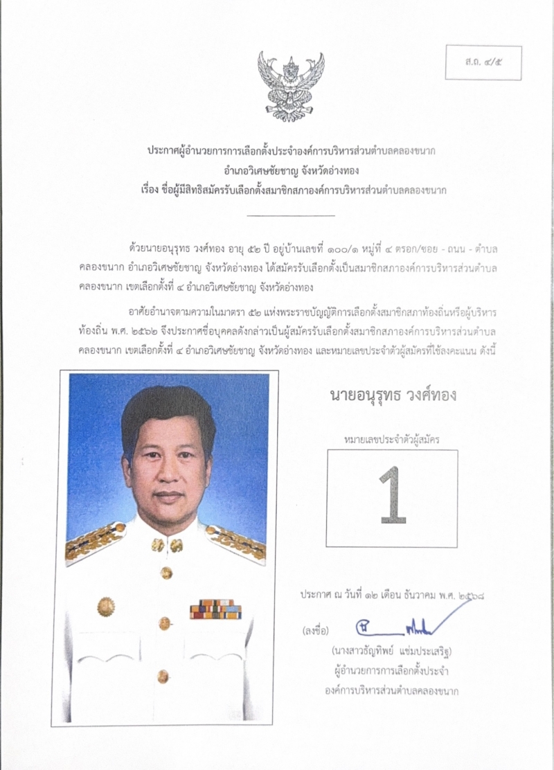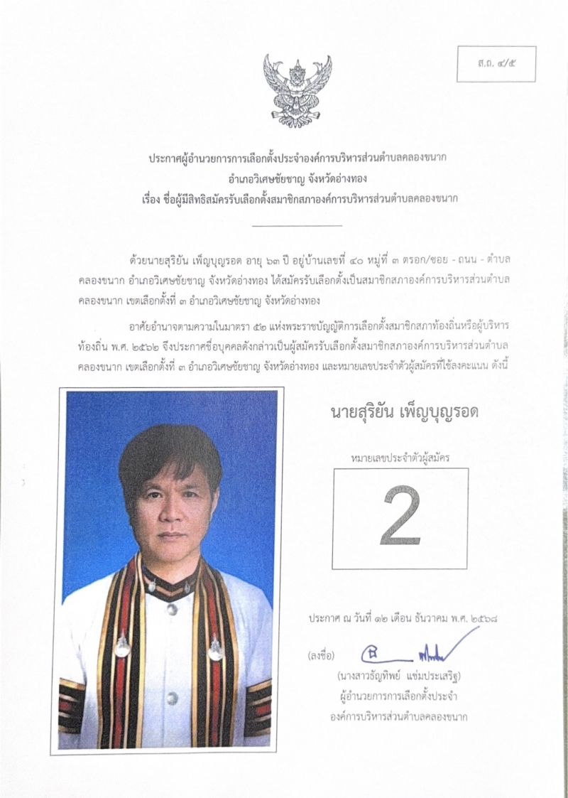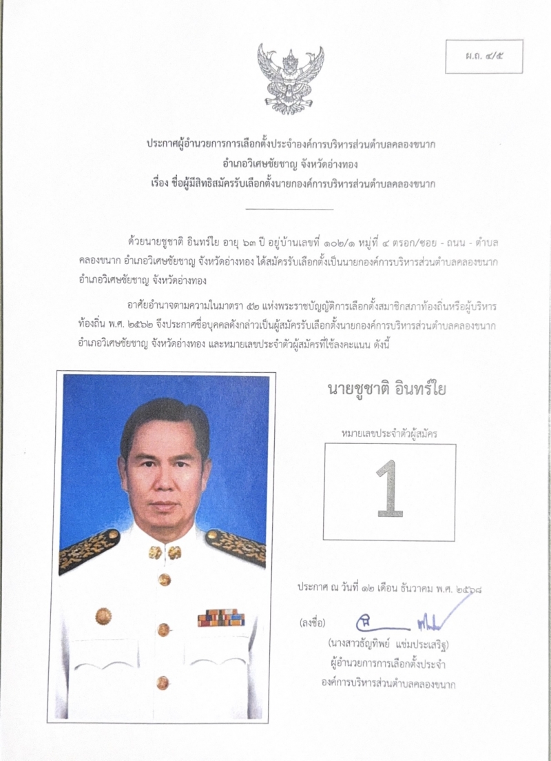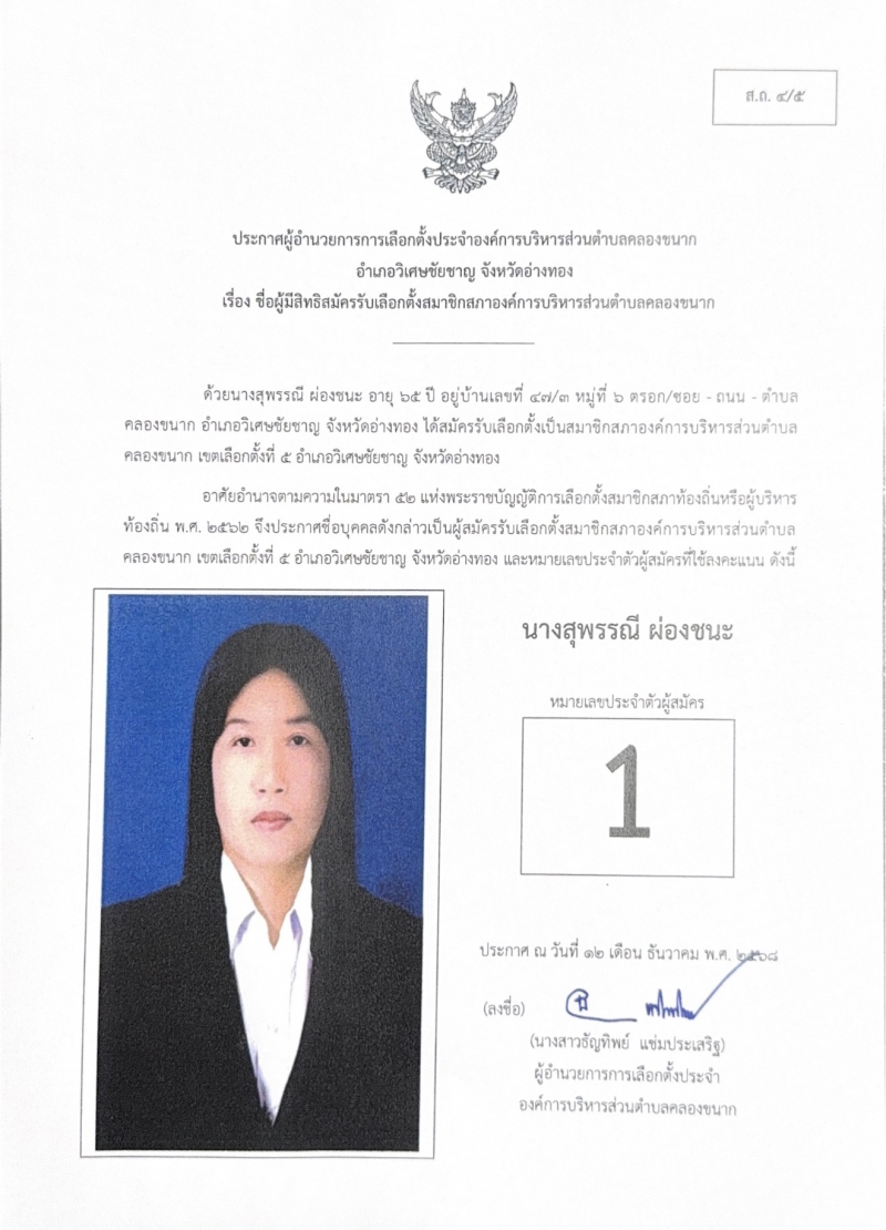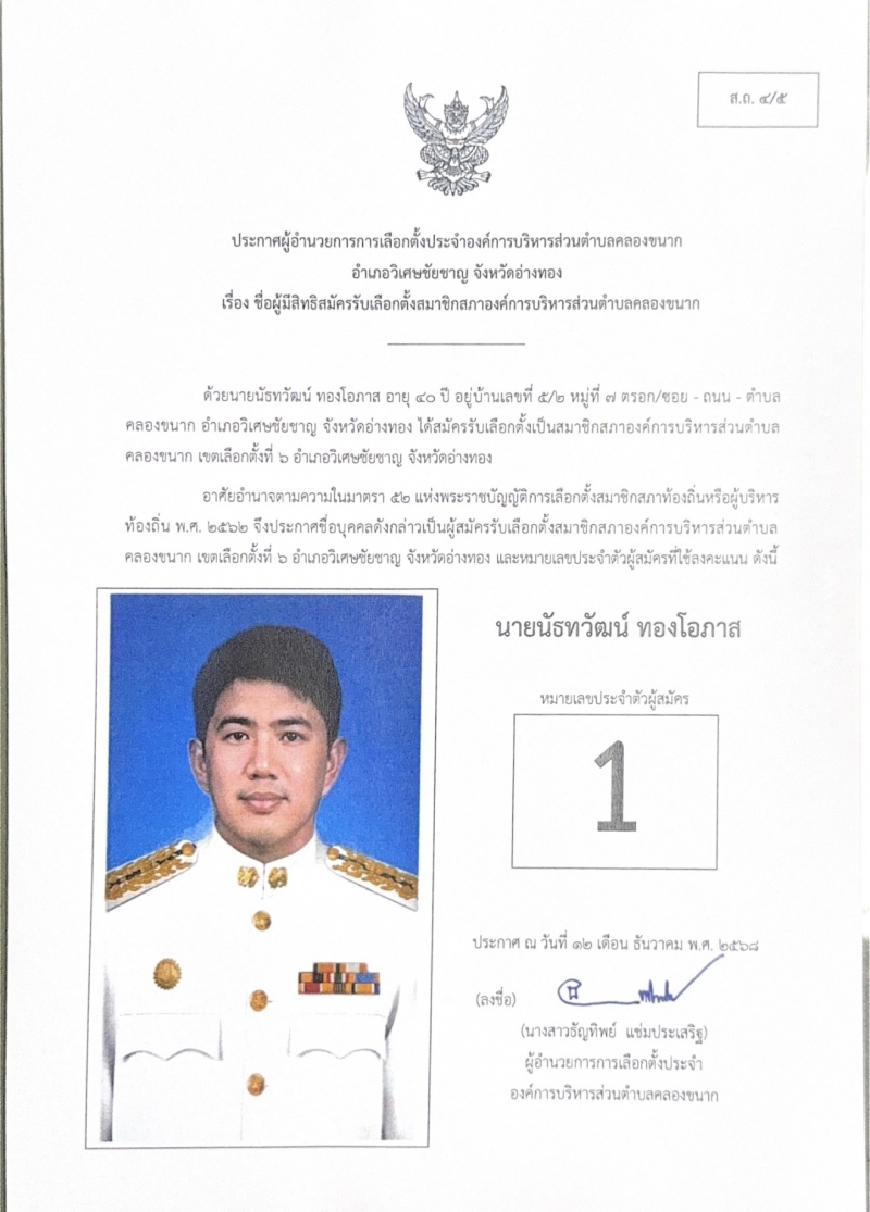 องค์การบริหารส่วนตำบลคลองขนาก ประกาศรายชื่อผู้มีสิทธิรับเลือกตั้ง สมาชิกสภา อบต. และ ผู้บริหารท้องถิ่น (ส.ถ. ผ.ถ. 4/4 และ 4/5 )