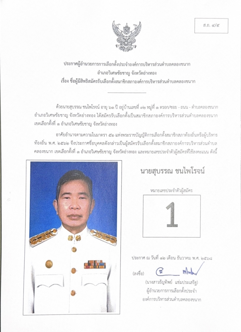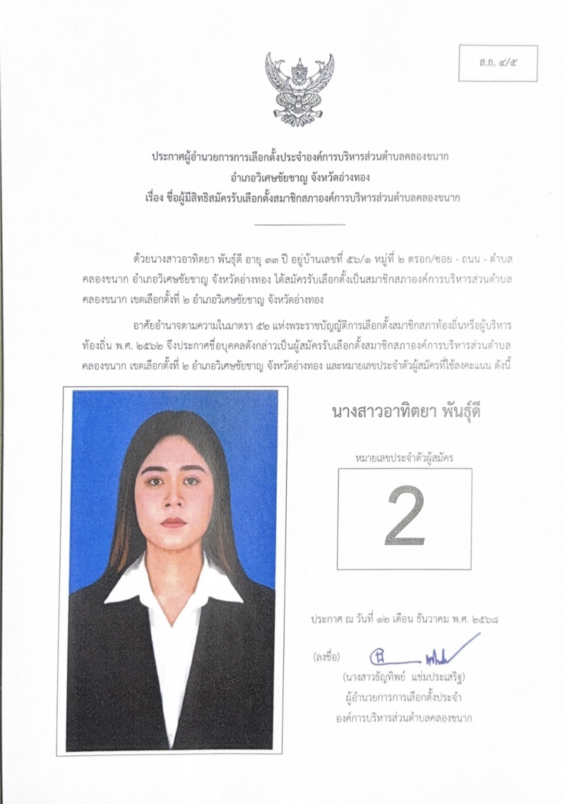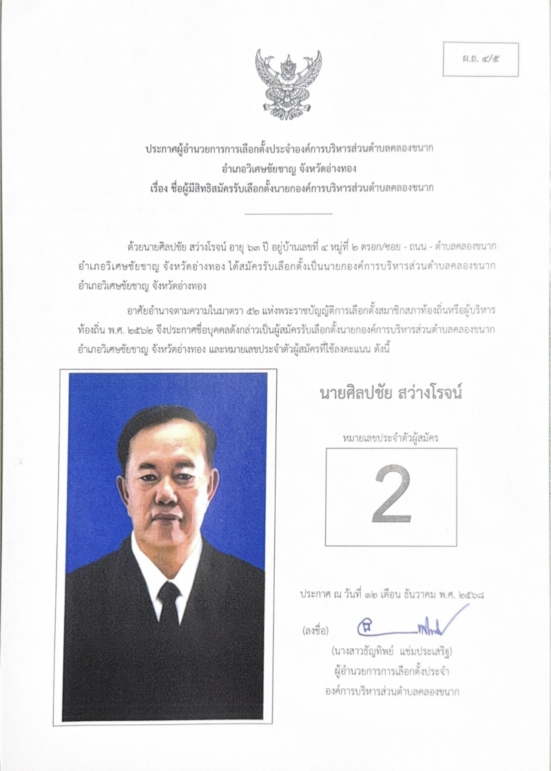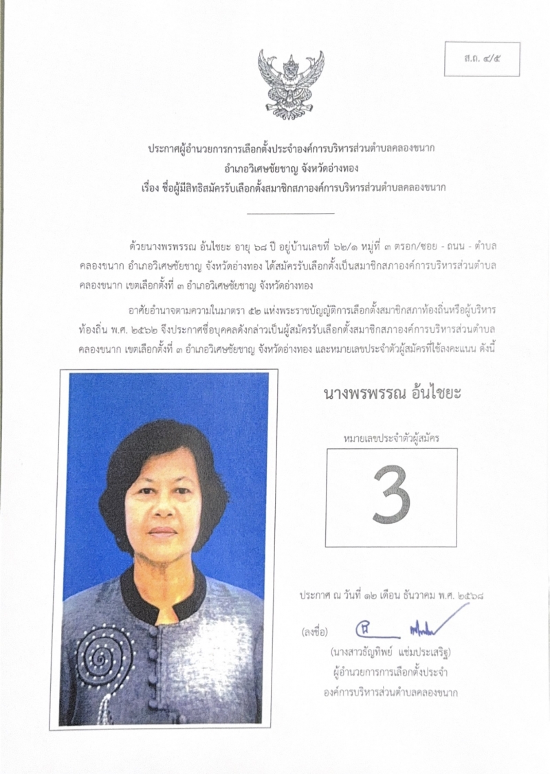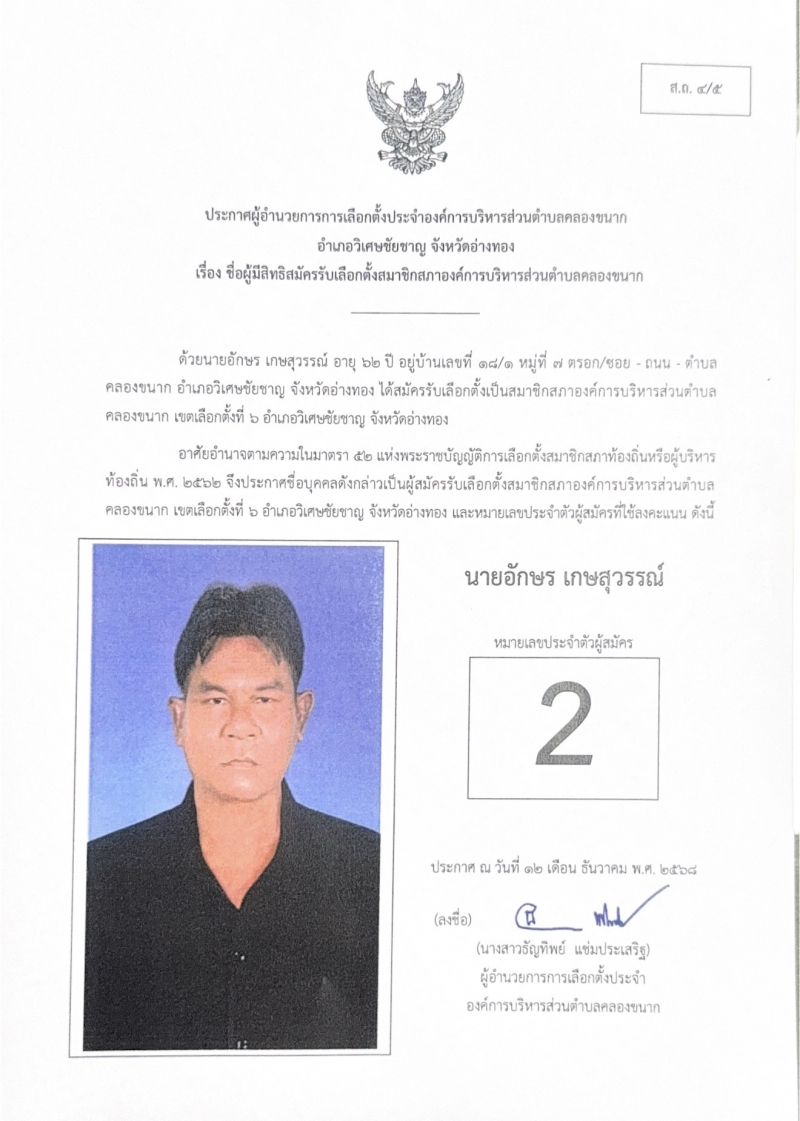 องค์การบริหารส่วนตำบลคลองขนาก ประกาศรายชื่อผู้มีสิทธิรับเลือกตั้ง สมาชิกสภา อบต. และ ผู้บริหารท้องถิ่น (ส.ถ. ผ.ถ. 4/4 และ 4/5 )