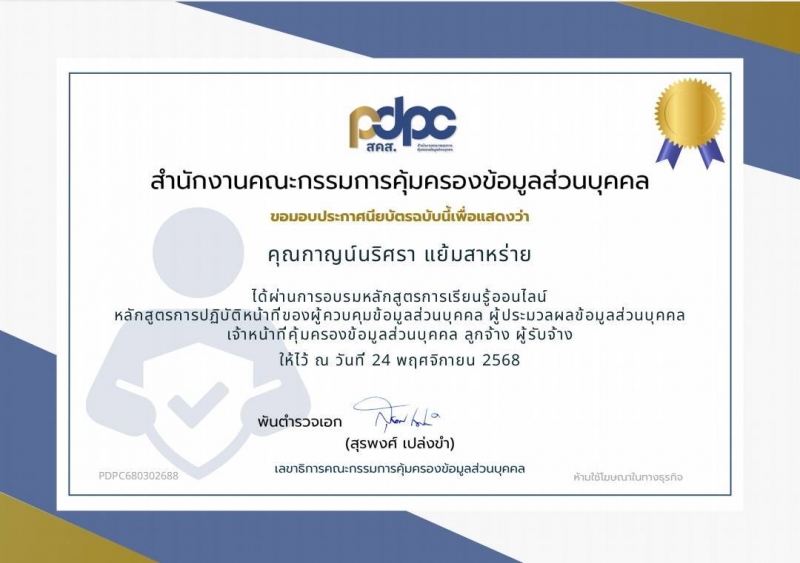 พนักงานองค์การบริหารส่วนตำบลคลองขนาก ได้รับมอบประกาศนียบัตรจากสำนักงานคณะกรรมการคุ้มครองข้อมูลส่วนบุคคล